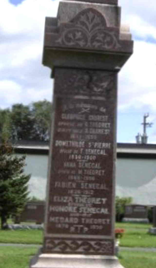 Pierre tombale de F[abien] Sénécal, époux de Domithilde Saint Pierre; de Anna Sénécal, épouse de M. Théoret; de Fabien Sénécal; et de Honoré Sénécal, époux de Éliza Théoret (R)