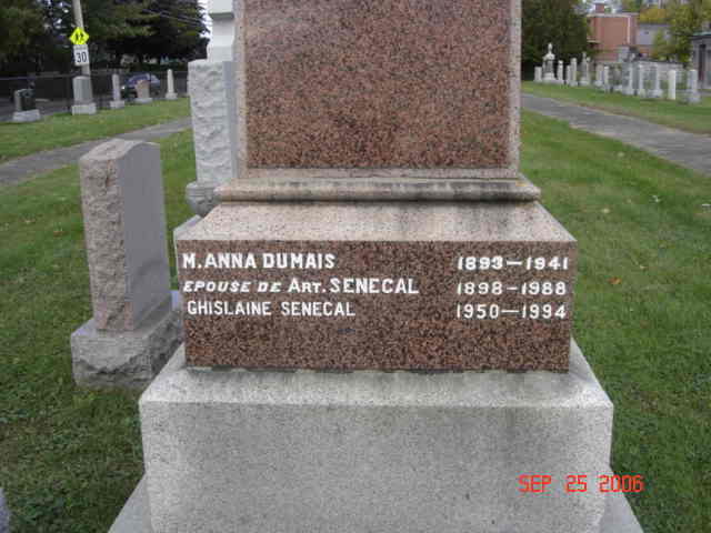 Pierre tombale de Arthur Sénécal, époux de Marie Anna Dumais; et de Ghislaine Sénécal (R)