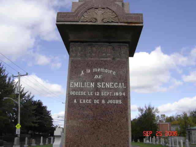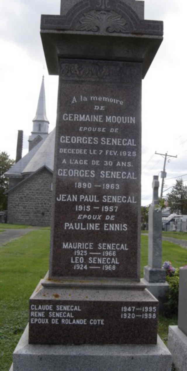 Pierre tombale de Georges Sénécal, époux de Germaine Moquin; Jean Paul Sénécal, époux de Pauline Ennis; Maurice, Léo, Claude Sénécal; René Sénécal, époux de Rolande Côté (R)