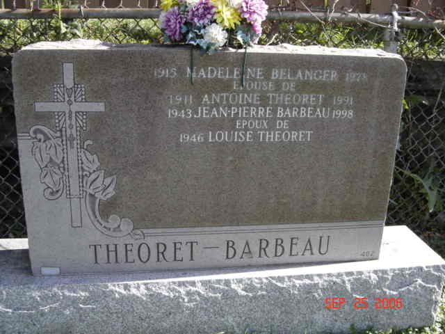 Pierre tombale de Antoine Théoret, époux de Madeleine Bélanger; et de Louise Théoret, épouse de Jean Pierre Barbeau (R)