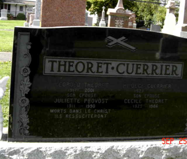 Pierre tombale de Léopold Théoret, époux de Juliette Provost; et de Cécile Théoret, épouse de Hildège Cuirrier (R)