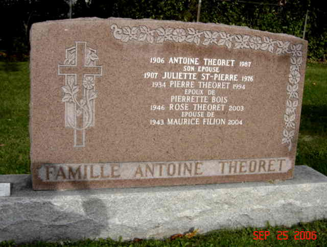 Pierre tombale de Antoine Théoret, époux de Juliette Saint-Pierre; de Pierre Théoret, époux de Pierrette Bois; et de Rose Théoret, épouse de Maurice Pilon (G2)