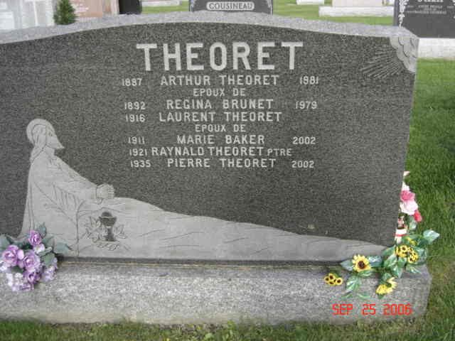 Pierre tombale de Arthur Théoret, époux de Régina Brunet; de Laurent Théoret, époux de Marie Baker; de Raynald Théoret, prêtre; et de Pierre Théoret (G2)