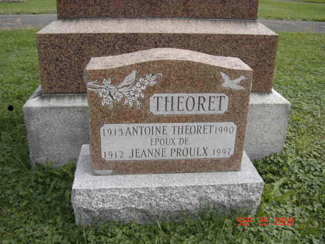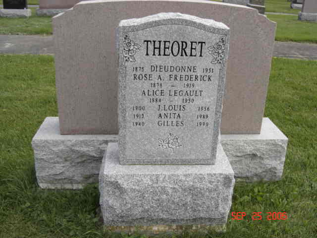 Pierre tombale de Dieudonné Théoret, époux en premières noces de Rose A. Frederick et en secondes de Alice Legault; et de J. Louis, Anita et Gilles Théoret (R)