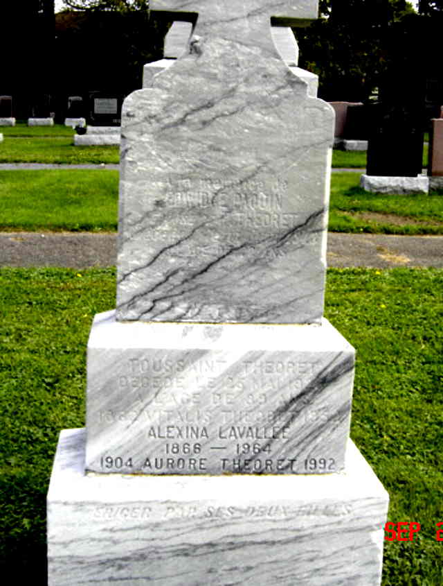 Pierre tombale de Toussaint Théoret, époux de Edwidge Paquin; de Vitalis Théoret, époux de Alexina Lavallée; et de Aurore Théoret (R)