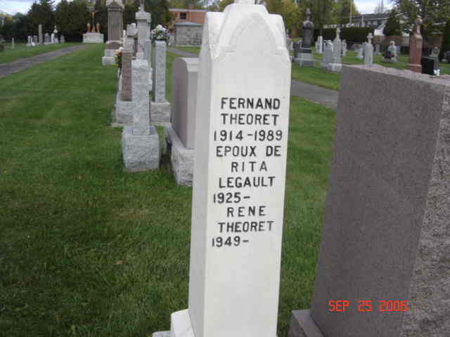 Pierre tombale de Fernand Théoret, époux Rita Legault; et de René Théoret (R)