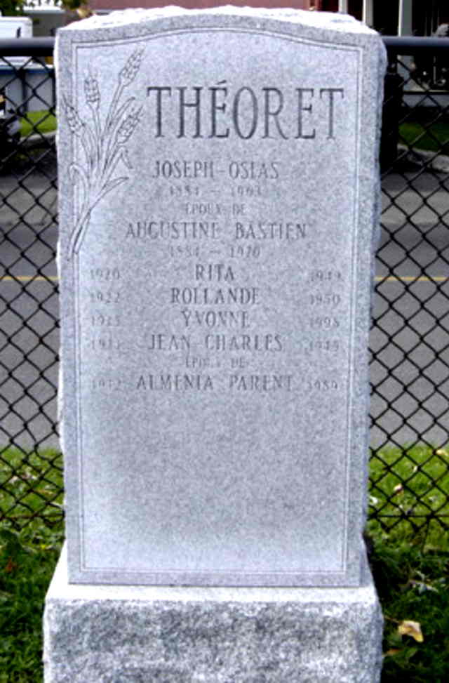 Pierre tombale de Joseph Osias Théoret, époux de Augustine Bastien; de Jean Charles Théoret, époux de Almenia Parent; et de Rita, Rollande et Yvonne Théoret (R)