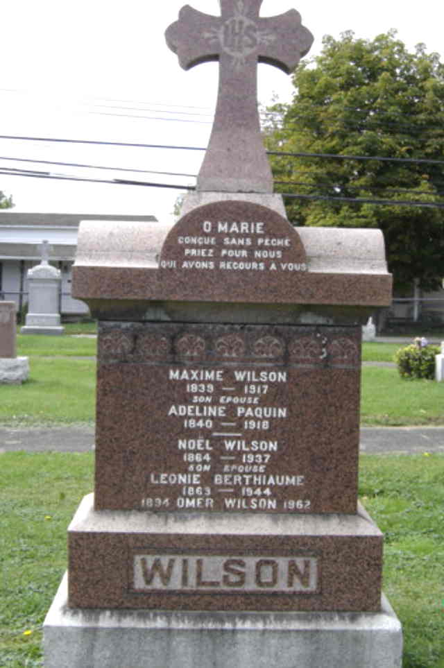 Pierre tombale de Maxime Wilson, époux de Adéline Paquin; de Noël Wilson, époux de Léonie Berthiaume; et de Omer Wilson (R)