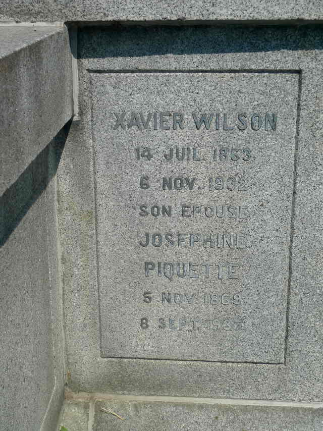 Pierre tombale de Xavier Wilson, époux de Joséphine Piquette (gravé sur le socle du Calvaire) (Photo de André Wilson) (R)