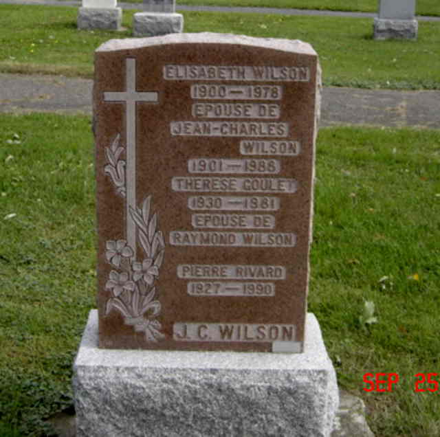 Pierre tombale de Jean Charles Wilson, époux de Elisabeth Wilson; de Elisabeth Wilson, épouse de Jean Charles Wilson; et de Raymond Wilson, époux de Thérèse Goulet (R)