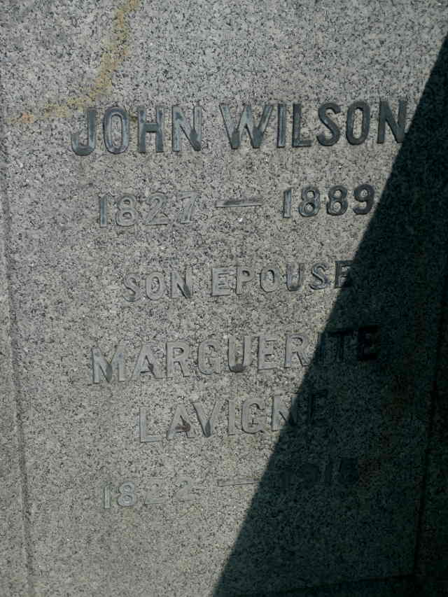 Pierre tombale de John Wilson, époux de Marguerite Poudrette Lavigne (gravé sur le socle du Calvaire) (Photo de André Wilson) (R)