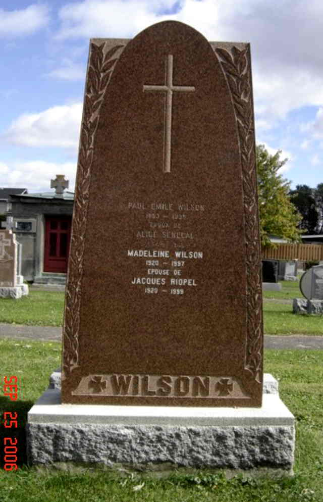 Pierre tombale de Paul Émile Wilson, époux de Alice Sénécal; et de Madeleine Wilson, épouse de Jacques Riopel (R)